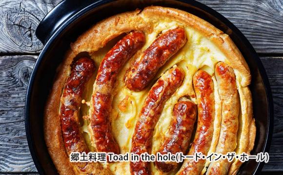 トード イン ザ ホールは英語で 穴の中のヒキガエル と言う意味のイギリス料理で 焼いたソーセージをヨークシャー プディングというパンケーキの親戚のような生地の中に入れてベイクしたものです 家庭料理でありますが パブでいただくパブ フードとしてもよく見